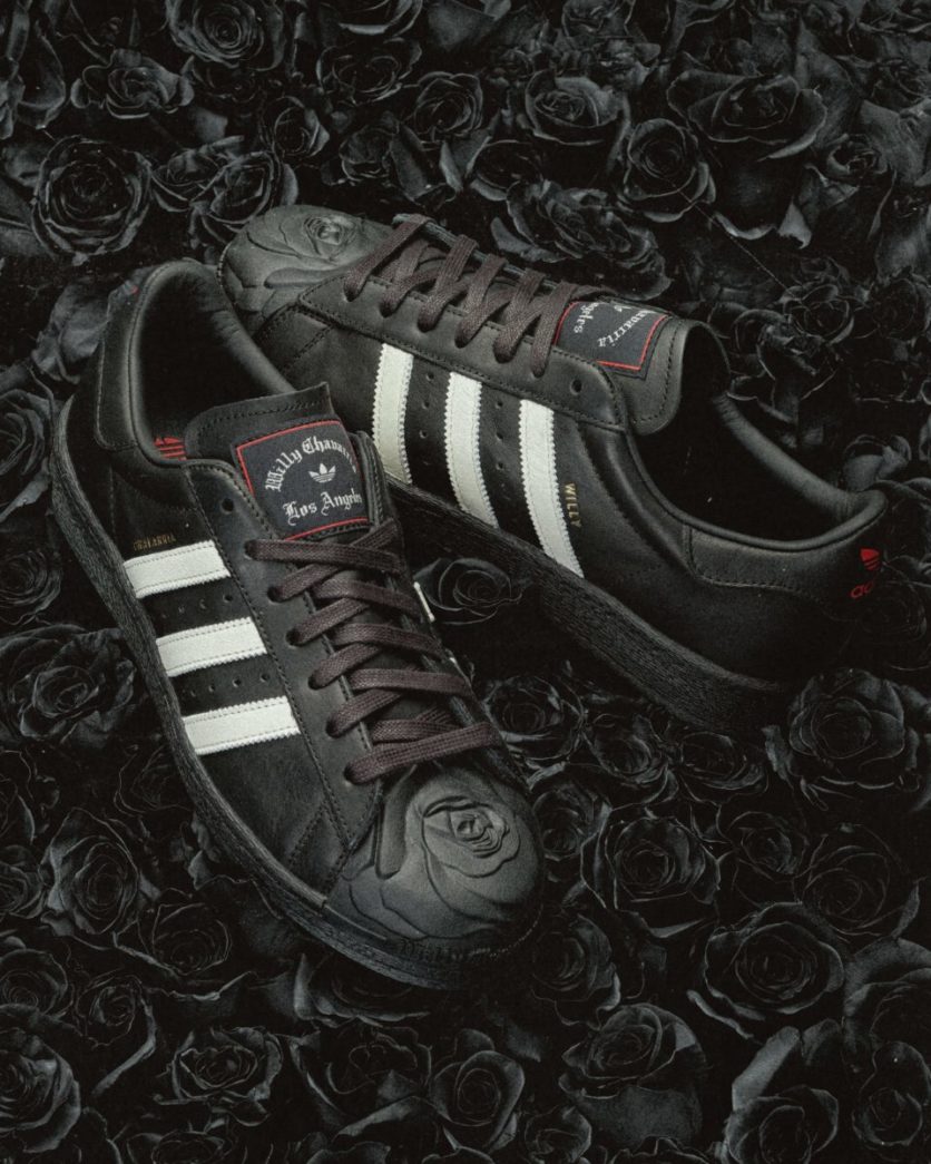 De volgende samenwerking betreft de adidas Superstar ‘Rose’. De sneaker is uitgevoerd in glad zwart leer met off-white en gouden details. Over de voorvoet is de naam ‘Willy Chavarria’ in Old English-typografie aangebracht. Co-branding op de tong en insole zorgt voor een consistent en ingetogen geheel.